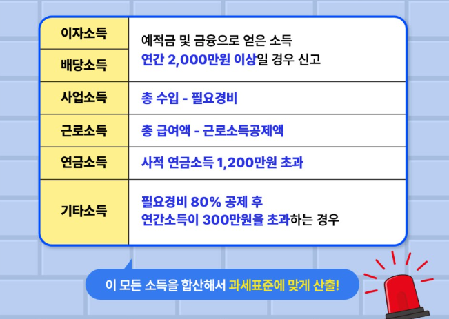 - 이자소득/배당소득: 예적금 및 금융으로 얻은 소득으로, 연간 2,000만원 이상일 경우 신고