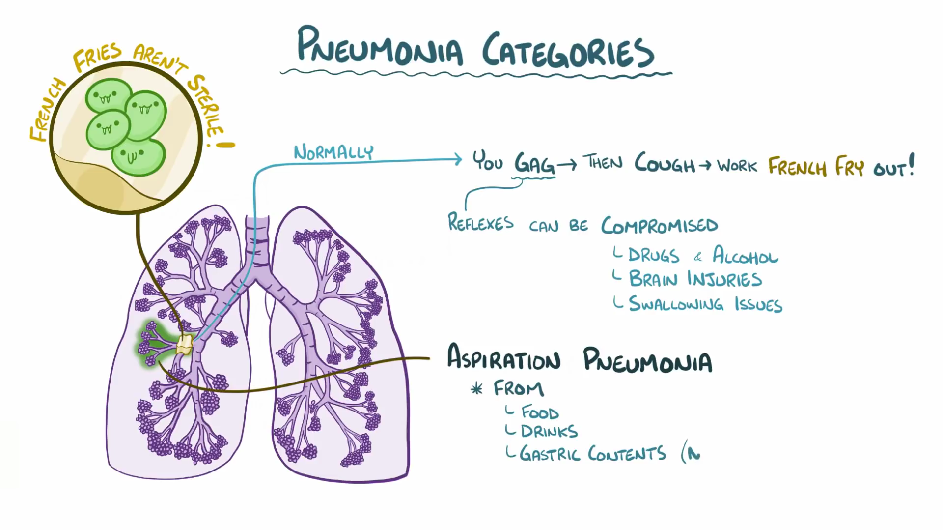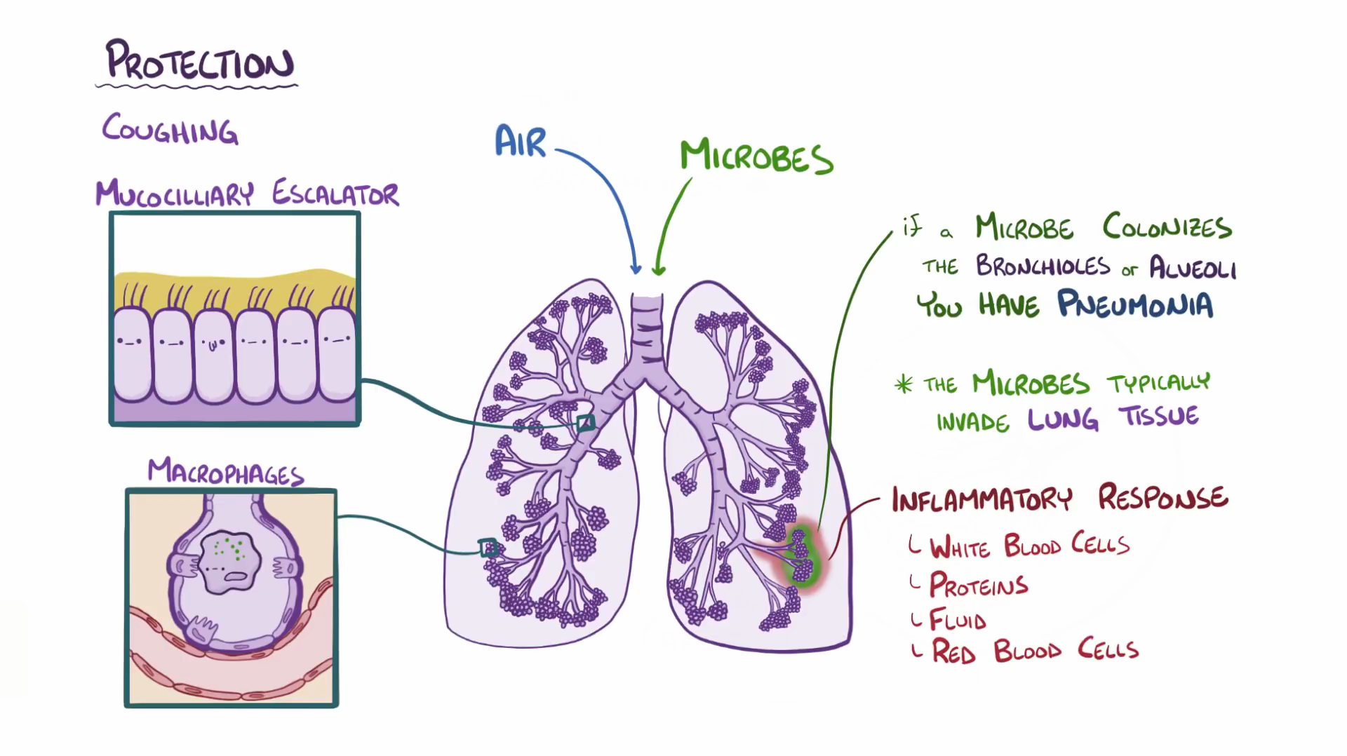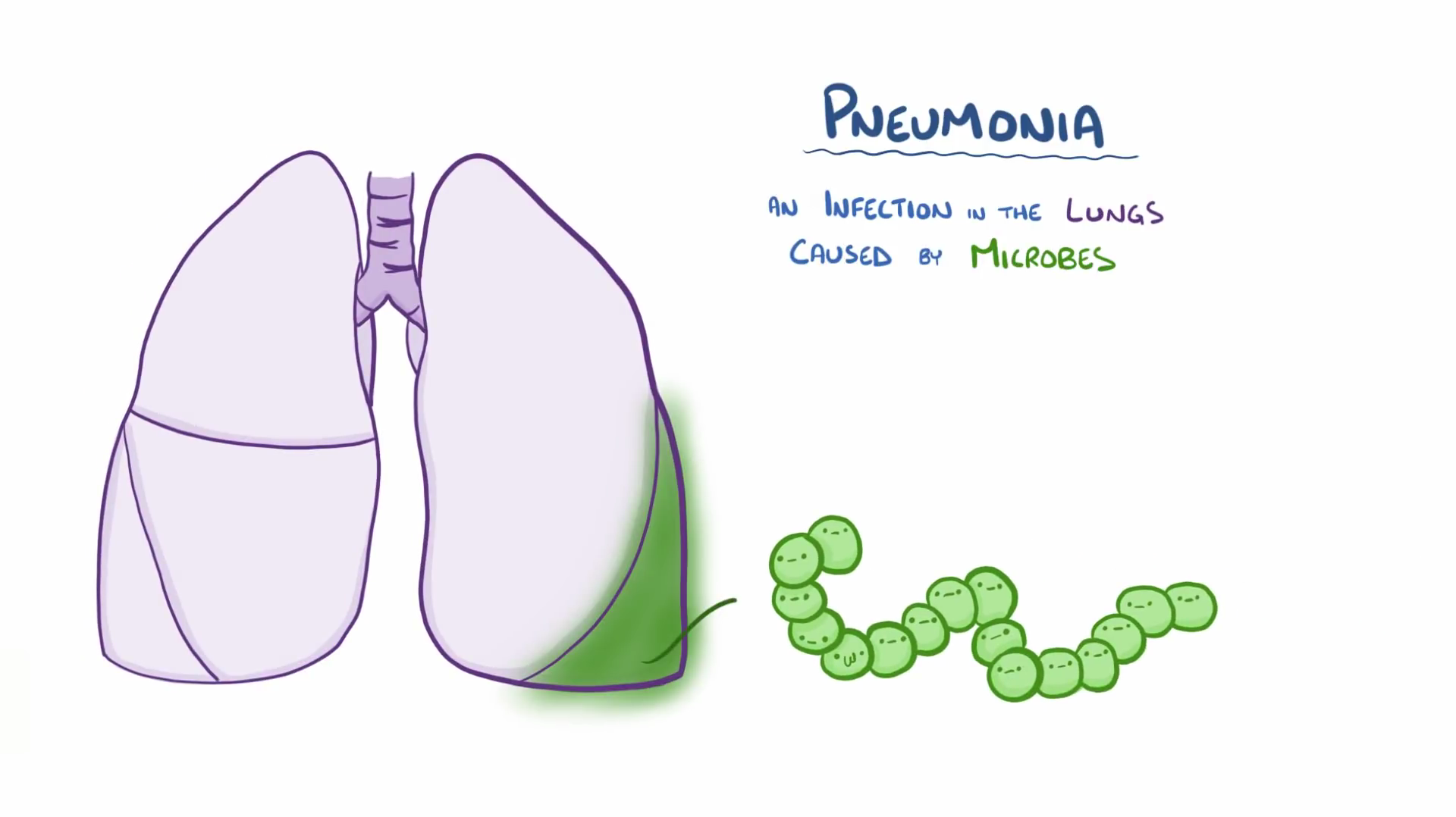 폐렴은 병을 일으키는 세균에 의해 세기관지 이하 부위 폐조직에 염증반응을 일으키는 질환입니다. 코와 인두의 기침이라는 방어기전과 폐섬모라는 얇은 기관의 구조물은 감염 물질이 폐까지 가는 것을 막는 역할을 하는데요. 방어기전이 약해지거나 병원균이 폐포까지 침투하여 염증이 생기는 경우, 폐렴을 유발한다고 합니다.